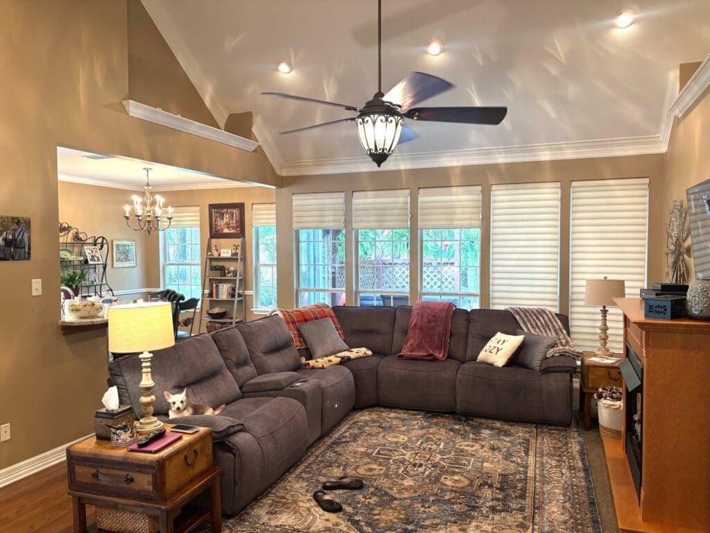 • Warm & Inviting Living Space – The large great room includes a gas log fireplace, vaulted ceilings, custom window shades, and plantation shutters.