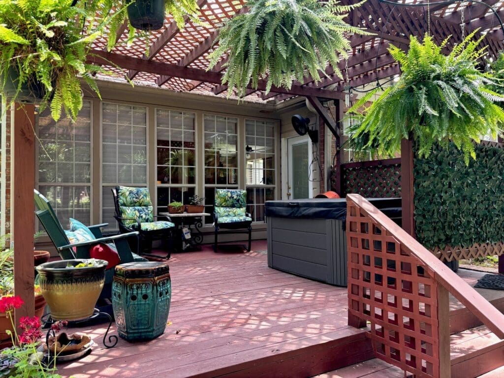 “Backyard of Lake Palestine home with hot tub, landscaped yard, and wired garden shed at 18378 Whippoorwill Lane.”!